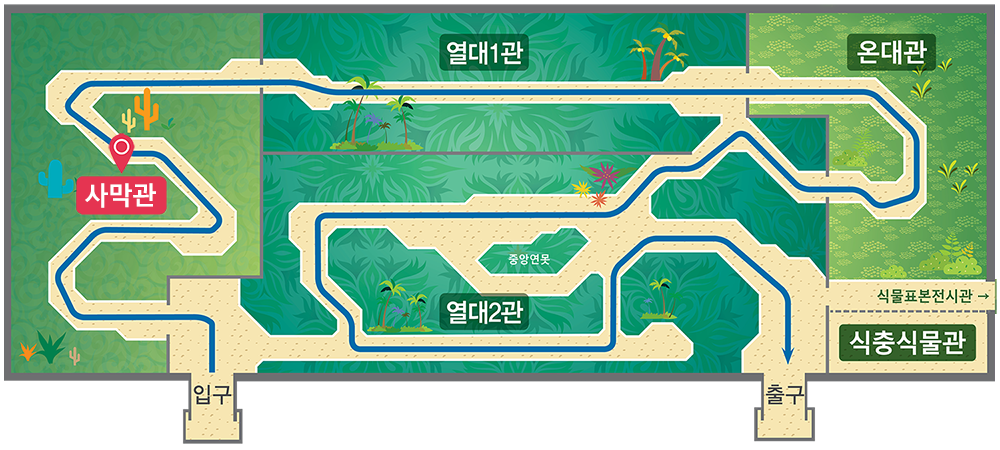 사막관 - 열대 1관 - 온대관 - 열대 2관 - 식충식물관 - 식물표본전시관 이 순서로 관람해주시면 됩니다.
